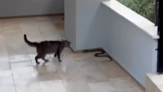 Öte yandan bir süre devam eden mücadelede yılan, apartman girişine yönelerek kapı korkuluklarına tırmandı. Kedinin peşini bırakmadığı yılan, daha sonra bina girişinden ayrılarak bahçedeki yeşil alana kaçtı. Kedi ve yılan bir süre sonra gözden kaybolurken, çevredeki vatandaşların yaşananları cep telefonu kamerasıyla kaydettiği görüldü. Görüntülerde kedinin yılanı dikkatle takip ettiği, zaman zaman patiyle hamle yaptığı anlar yer aldı.