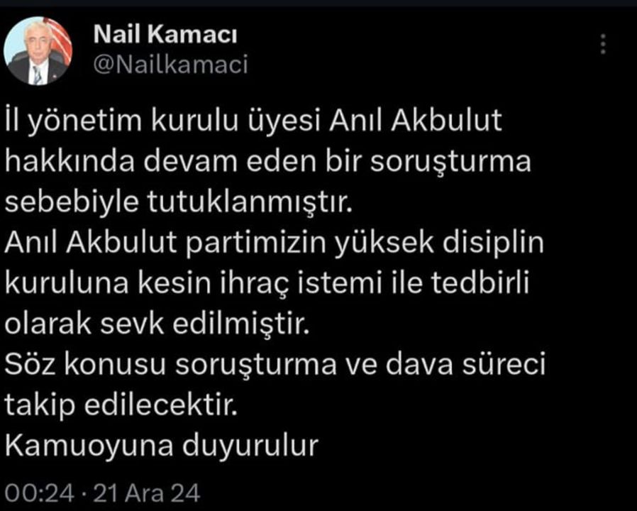 Akbulut'un tutuklanmasıyla ilgili sosyal medyadan yazılı açıklama yapan CHP Antalya İl Başkanı Nail Kamacı, şunları kaydetti: "İl yönetim kurulu üyesi Anıl Akbulut hakkında devam eden bir soruşturma sebebiyle tutuklanmıştır. Anıl Akbulut partimizin yüksek disiplin kuruluna kesin ihraç istemi ile tedbirli olarak sevk edilmiştir. Söz konusu soruşturma ve dava süreci takip edilecektir.”