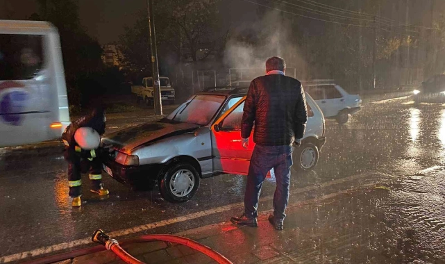 Olay, Serik ilçesine bağlı Orta Mahalle Başöğretmen Caddesi'nde akşam saatlerinde meydana geldi. Havanın yağışlı olmasından dolayı çocuğunu okuldan almak için otomobille yola çıkan sürücü, motordan dumanlar yükselince aracını yol kenarına çekti. İhbar üzerine olay yerine gelen itfaiye ekipleri, kısa sürede yanan aracı söndürdü. Yangında araçta hasar meydana geldi.