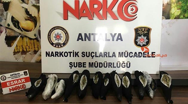 İl Emniyet Müdürlüğü Narkotik Suçlarla Mücadele Şube Müdürlüğü ekiplerince, kentte uyuşturucu ticareti yapan kişi ve gruplara yönelik başlatılan çalışma kapsamında, Aksu ilçesi Serik Caddesi'nde bir akaryakıt istasyonu önünde oluşturulan uygulama noktasında şüphe üzerine durdurulan araçta arama yapıldı. Narkotik köpeğinin de kullanıldığı aramada, araçta 12 paket halinde 2 kilo 300 gram esrar ele geçirildi. Olayla ilgili olarak M.A. A. ile D.Ö isimli şahıslar gözaltına alındı.