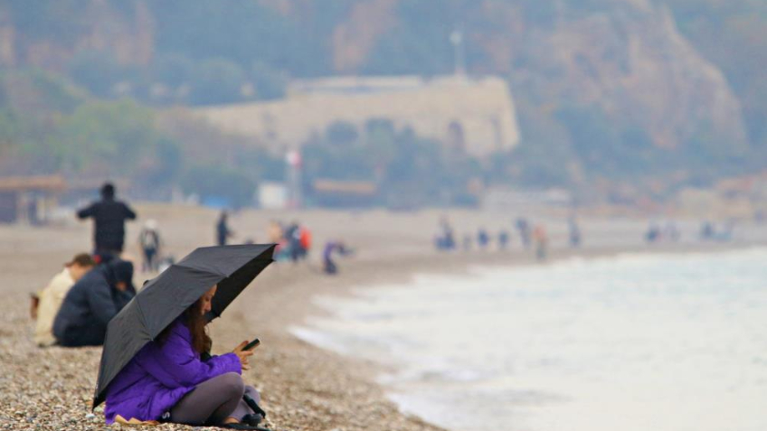 Antalya’da pazar gününü değerlendirmek isteyen kent sakinleri ve yabancı turistler yer yer yağan yağmura rağmen Konyaaltı Sahili’ne akın etti.