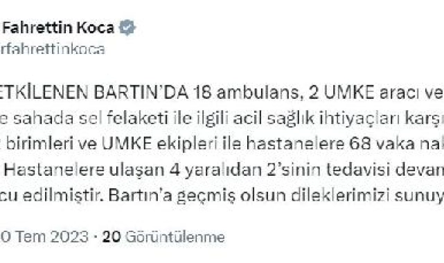 Bakan Koca, Twitter hesabından yaptığı açıklamada, "Selden etkilenen Bartın'da 18 ambulans, 2 UMKE aracı ve 56 personelle sahada sel felaketi ile ilgili acil sağlık ihtiyaçları karşılanmış, ayrıca 112 birimleri ve UMKE ekipleri ile hastanelere 68 vaka nakil olmuştur. Hastanelere ulaşan 4 yaralıdan 2'sinin tedavisi devam ediyor, 2 kişi taburcu edilmiştir. Bartın'a geçmiş olsun dileklerimizi sunuyoruz" ifadelerini kullandı.