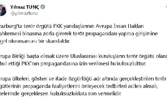 Bakan Tunç, konuya ilişkin Twitter üzerinden yaptığı açıklamada, "Strazburg'ta terör örgütü PKK yandaşlarının Avrupa İnsan Hakları Mahkemesi binasına zorla girerek terör propagandası yapma girişimine engel olunmaması bir skandaldır. Avrupa Birliği başta olmak üzere Uluslararası kuruluşların terör örgütü olarak kabul ettiği PKK'nın propagandasına izin verilmesi hukuksuzluktur. Avrupa ülkeleri, gösteri ve ifade özgürlüğü adı altında gerçekleştirilen terör örgütlerinin propaganda faaliyetlerini önleyecek tedbirleri acilen almalı, ülkelerinde gerçekleşen hukuksuzluklara son vermelidir" ifadelerini kullandı.