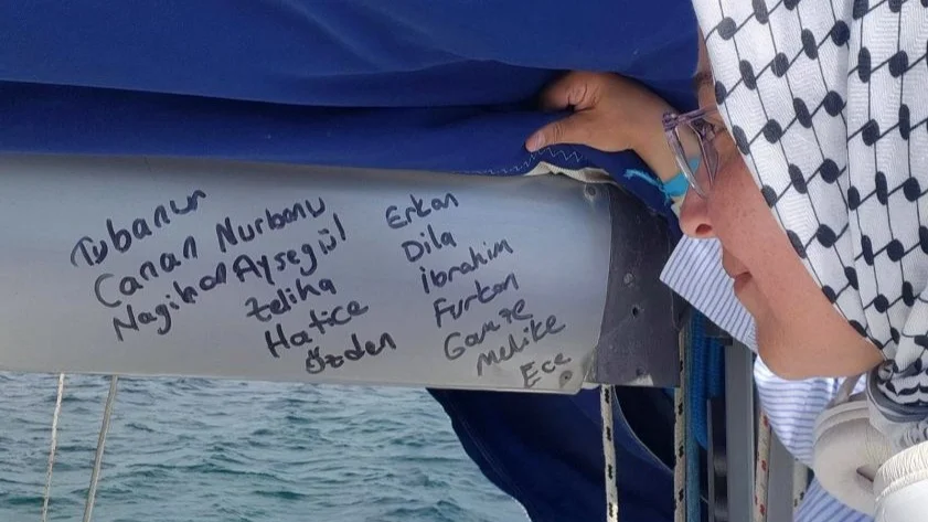 Küresel Sumud Filosu’ndaki İtalya’nın Sicilya Adası’ndan 20 gün önce yola çıkan 'Morgana' adlı teknedeki Kadın ve Demokrasi Vakfı (KADEM) İletişimden Sorumlu Genel Müdür Yardımcısı, gazeteci, aktivist Semanur Sönmez Yaman, eşi Erkan, çocukları Furkan, Dila, İbrahim, gelini Gamze ve torunları Melike ve Ece Yaman ile annesi Özden Sönmez, kardeşi Tuğba Nur Sönmez ve sevdiği arkadaşlarının isimlerini teknesinin direğine yazdı.