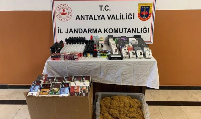 ANTALYA'nın Alanya ilçesinde jandarma ekipleri bir iş yerine düzenlenen baskında piyasa değeri 100 bin lira olan elektronik sigara, elektronik sigara likidi, kıyılmış tütün ve makaron ele geçirildi