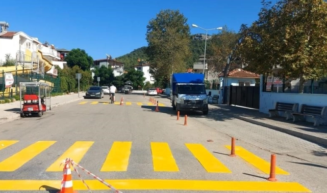 Kemer'de ana cadde üzerinde ve okul giriş bölgelerinde bulunan yaya geçitleri öğrenci ve yaya güvenliği için çift kompenantlı yol çizgi boyası ile yenileniyor