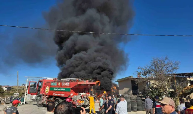 Manavgat'ta bir işyerinin trafosunda başlayan yangın bitişiğinde bulunan 3 bin balya samanın yanmasına neden oldu. Lastiklerinin alev almasıyla gökyüzünde oluşan siyah duman bulutları kilometrelerce uzaktan göründü.