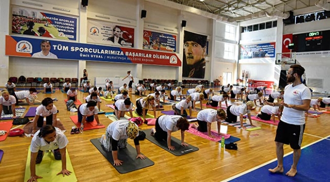 Muratpaşa Belediye Başkanı Ümit Uysal’ın sporda toplumcu yaklaşım modelinin en büyük organizasyonlarından spor okulları kapsamında her Cuma Gazi Mustafa Kemal Atatürk Spor Salonu’nda yoga seansı düzenleniyor. Bu hafta 21 Haziran Dünya Yoga Günü’ne denk gelen seans için Antalya’nın önde gelen yoga akademileri özel bir program düzenledi. Özel seans için Muratpaşa sakinleri spor salonunda bir araya geldi ve 60’ın üzerinde çoğunluğu kadınlardan oluşan grup 1 saat boyunca yoga yaptı.