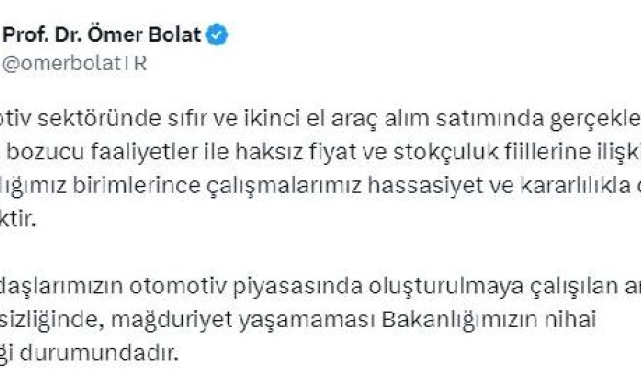 Bakan Bolat, sosyal medya hesabından yaptığı açıklamada, "Otomotiv sektöründe sıfır ve ikinci el araç alım satımında gerçekleşen piyasa bozucu faaliyetler ile haksız fiyat ve stokçuluk fiillerine ilişkin, bakanlığımız birimlerince çalışmalarımız hassasiyet ve kararlılıkla devam edecektir. Vatandaşlarımızın otomotiv piyasasında oluşturulmaya çalışılan arz talep dengesizliğinde, mağduriyet yaşamaması bakanlığımızın nihai önceliği durumundadır" dedi.