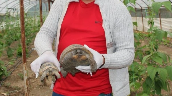 ANTALYA'nın Kumluca ilçesinde çiftçilik yapan Adem Kaptan (32), serasına dadanan kaplumbağaların ürünlerine zarar verdiğini söyledi.