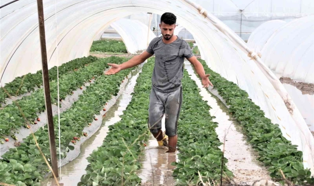 Çaresizlik içerisinde yaşadıklarını anlatan Eyüp Doğruyol, "5 dönüm alan üzerinde çileğim var. Halimizi görüyorsunuz, biz bittik. Bir senelik emeğimiz deprem olur gibi 5 dakikada gitti. Su kanalı bir yerde tıkandı, taşan su çilek seralarına doldu. Bu meyve bitti, biz bittik. Hiçbir şey kaldıramayız, bütün kök de gitti. 7 kişinin 1 yıllık emeği var. Nereden nereye geldik, 7 ay baktık, 5 dakikada heba oldu. Daha hiç toplamamıştım. Yeni başlayacaktım. Hazır hale getirdik, nasip olmadı. Bu durum her sene yaşanıyor. Biz bunu her yıl yaşıyoruz. Ben kendim kanal kazdırdım, çare olmadı" dedi.