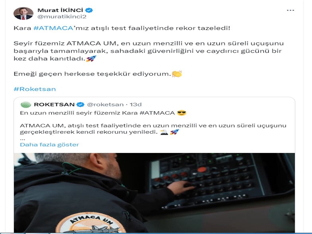 Şirketin sosyal medya hesabından yapılan açıklamada, "En uzun menzilli seyir füzemiz Kara Atmaca. Atmaca UM, atışlı test faaliyetinde en uzun menzilli ve en uzun süreli uçuşunu gerçekleştirerek kendi rekorunu yeniledi.