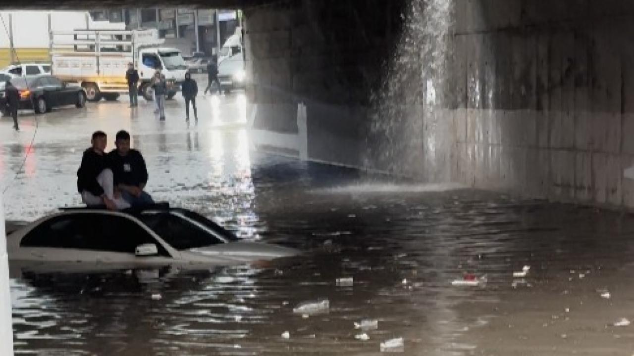 Zaman zaman dolu yağışının etkili olduğu ilçenin Demre Toptan Hali’nin olduğu noktadaki üst geçidin altında Mercedes marka bir araç mahsur kaldı. Suya gömülen araçtaki iki kişi itfaiye ekiplerince kurtarıldı.